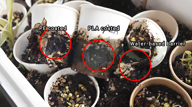 Efter 245 dagar hade den vattenhaltiga fodrade papperskoppen helt graderat, fibrerna i PLA hade nedbrutits, filmen av PLA hadruptured och filmen av PE var i princip intakta.